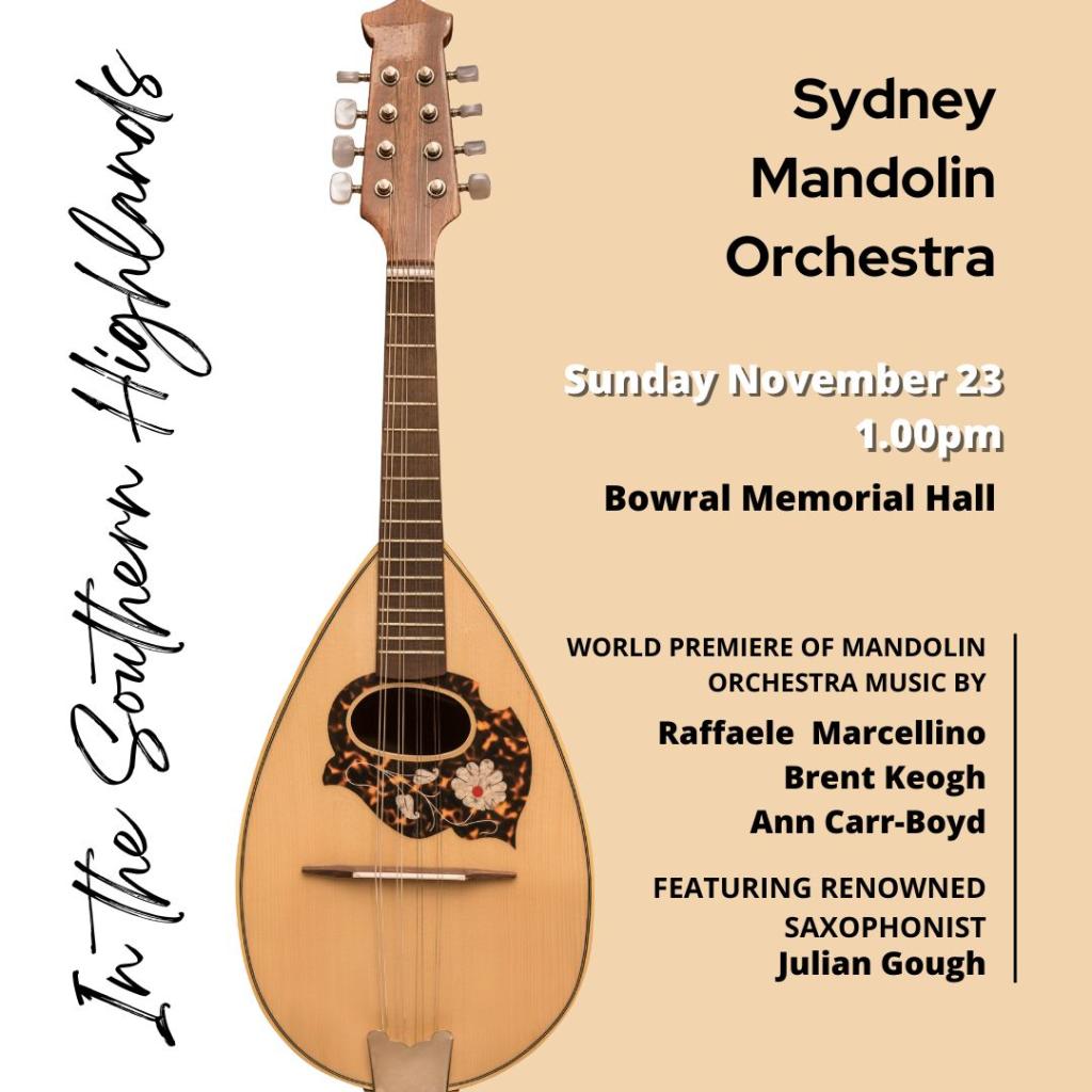 ABOUT: For its debut performance in Bowral, SMO will present an exciting program of mandolin music including two world premieres by Sydney based composers Raf Marcellino – Orana Journey, and Brent Keogh – Four Swordsmen. The concert will also feature the wonderful talents of renowned saxophonist Julian Gough in Gunsenheimer’s Blues Sonata.
